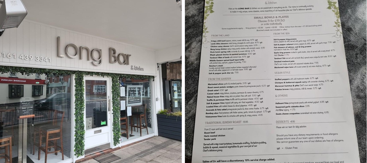 Every visit to Long Bar feels like stepping into my own living room. The warmth of the staff, their personal touch, and the way they know us by name create such a welcoming atmosphere. It’s rare to find a place that makes you feel so at home. Now, let’s talk about the food—because Chef Dave is truly outstanding. I don’t usually do “best,” but Dave? He cooks a Sunday roast that is nothing short of exceptional. And it’s not just the roast—every dish I’ve had here has been fantastic. You can tell there’s real passion behind every plate. I come here regularly, whether it’s for a meal, a drink with friends, or—let’s be honest—sometimes more than one drink! It’s always a great experience. This is the first time I’ve taken the time to write a review, not because I didn’t want to, but because I never felt the need—Long Bar speaks for itself. But I do think it’s important to acknowledge the people who put passion into what they do, and Chef Dave and the whole team here deserve all the recognition. As a proud Bramhall local and a small business owner myself, I believe in supporting our village’s businesses. Places like Long Bar make all the difference in creating a welcoming community. If you haven’t been yet, you absolutely should. Highly recommended!